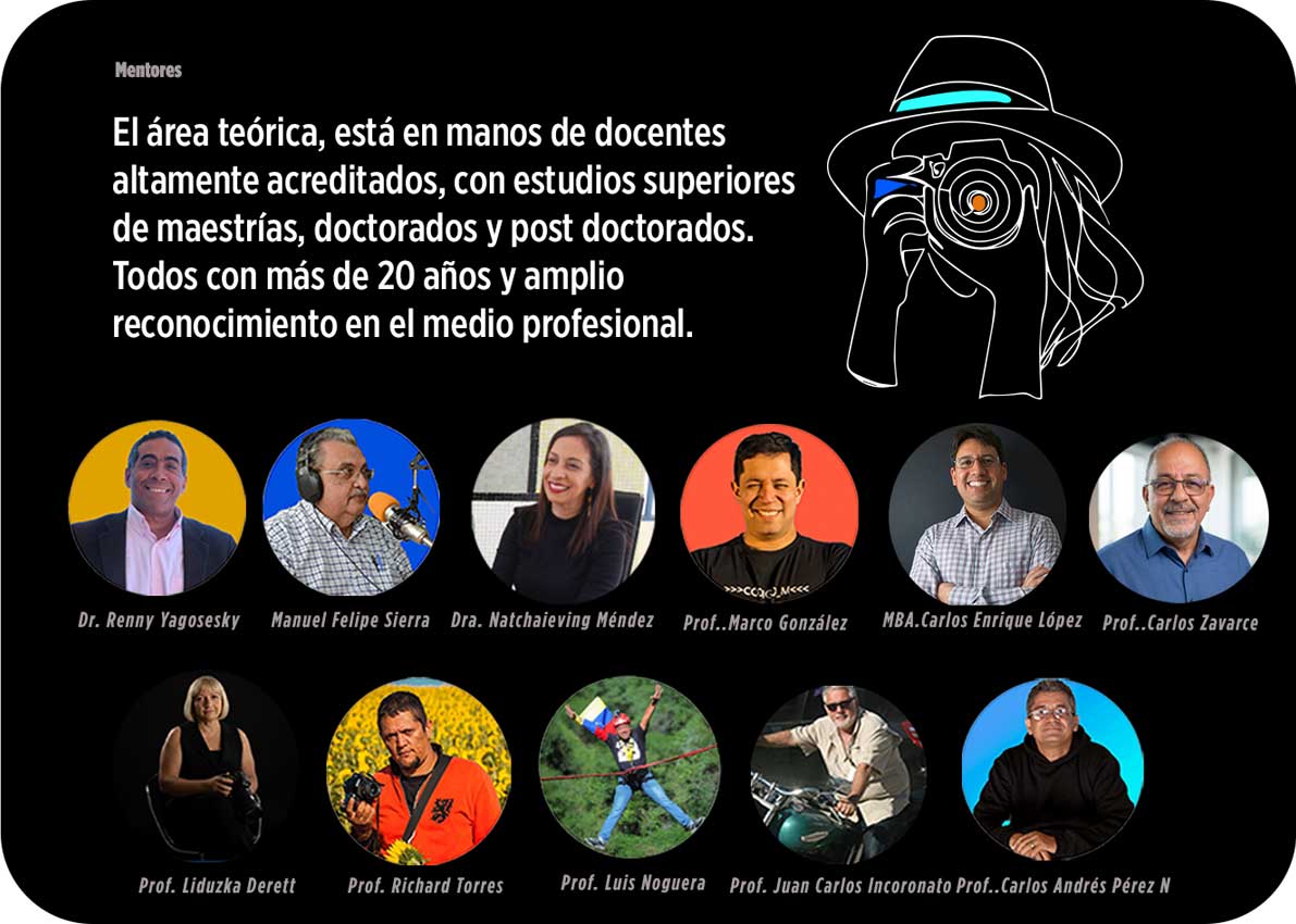 192 horas académicas en 4 módulos de contenido: Comunicación estratégica, Gestión Digital, Educación y por supuesto Fotografía. Con aval universitario y certificación del Círculo de Reporteros Gráficos de Venezuela